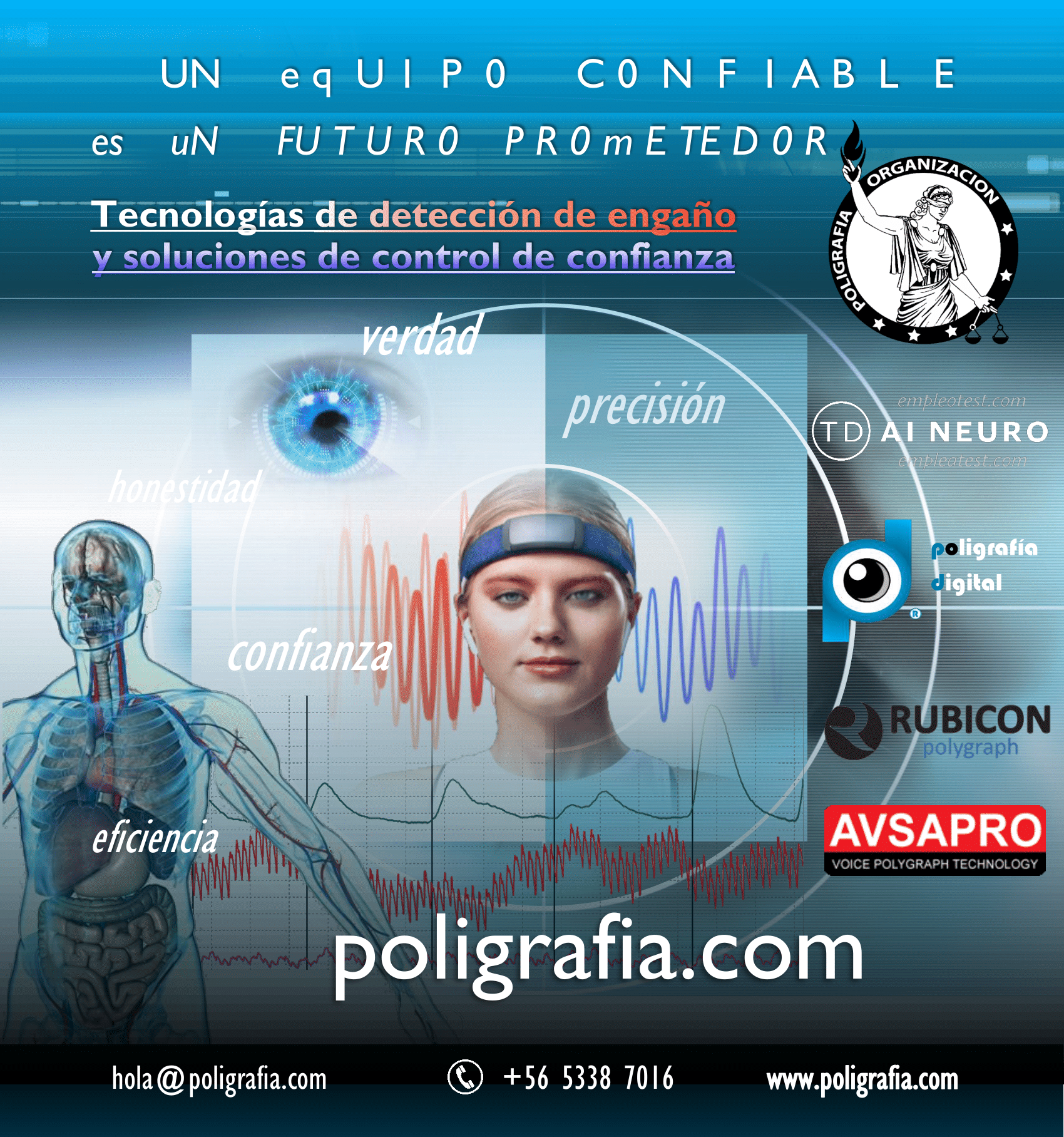 Somos un equipo de Expertos en Ingeniería Biomédica, Neurociencias, y Criminología, con sede en la Ciudad de México, presencia en diversos estados de la República Mexicana y actividad comercial en toda América Latina, quienes trabajamos en colaboración con multiples empresas alrededor del mundo, como lo son POLIGRAFÍA | ORGANIZACIÓN (de México), AVSAPRO (de Sudáfrica), POLIGRAFÍA DIGITAL (de México) y RUBICON NEUROPOLYGRAPH (de Europa), para brindar la propuesta más COMPLETA, de Tecnologías CONFIABLES en Detección de Engaño, a costos altamente COMPETITIVOS.